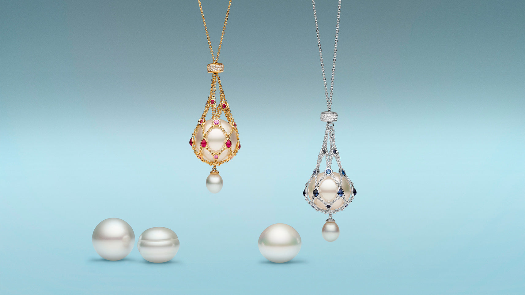 An Australian South Sea pearl is suspended within this sculptural net, echoing the form of vintage glass buoys that once marked pearl oyster beds.