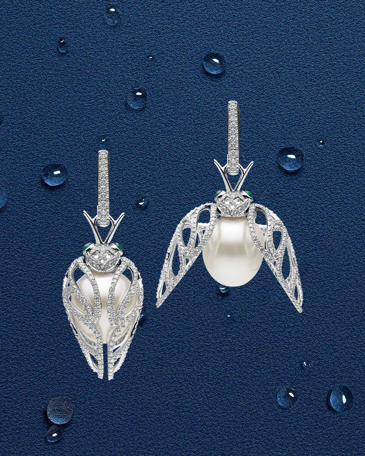 Articulated wings, shimmering with white diamonds, open and close with a gentle touch, revealing or cocooning the precious pearl. A transformative silhouette that embodies seasonal renewal.