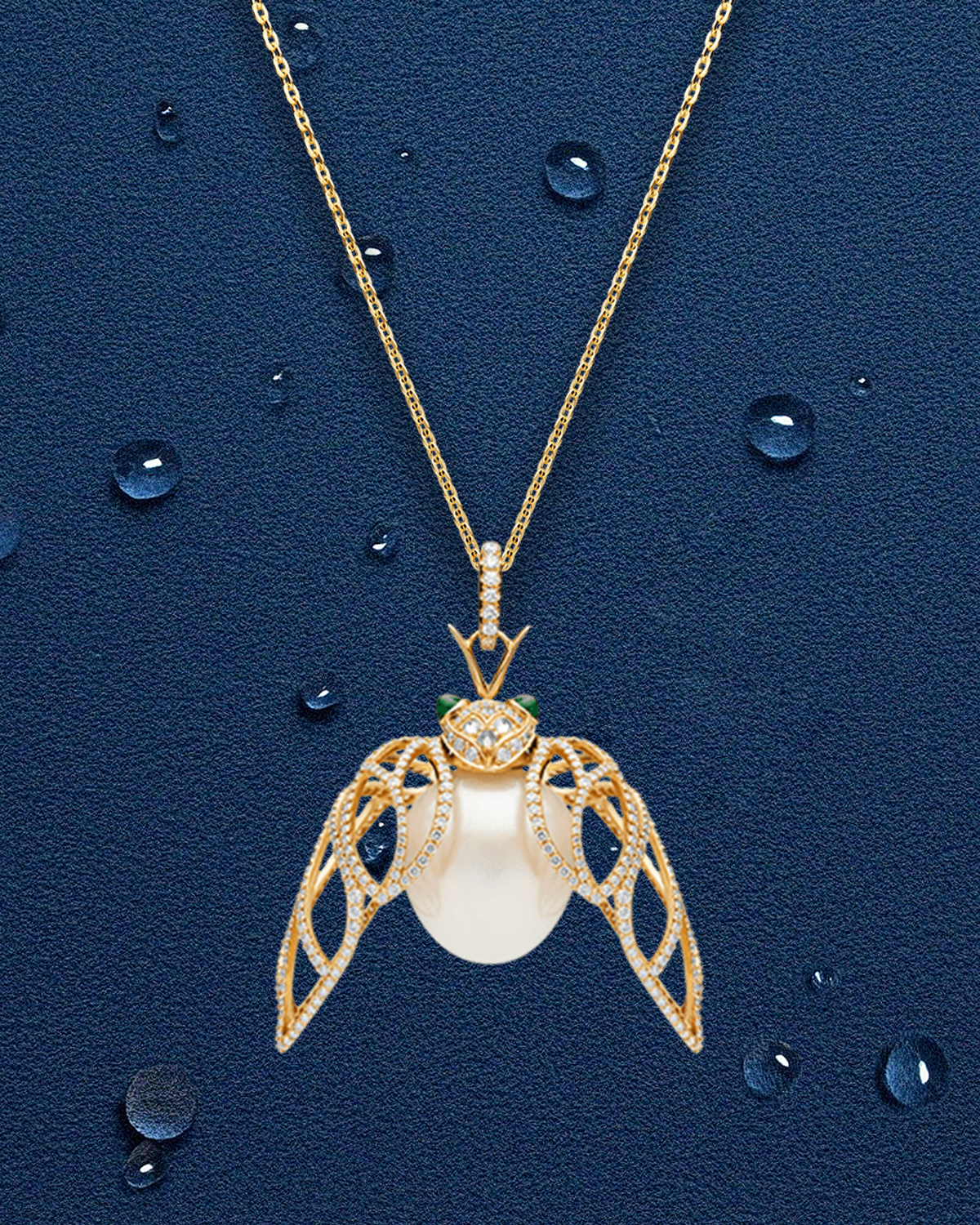 Representing love and eternity, natural diamonds bring brilliance to the Monsoon Cicada. Hand-set across articulated wings, each stone captures the glimmer of rainfall as the monsoon arrives, illuminating the pearl beneath with life and light.