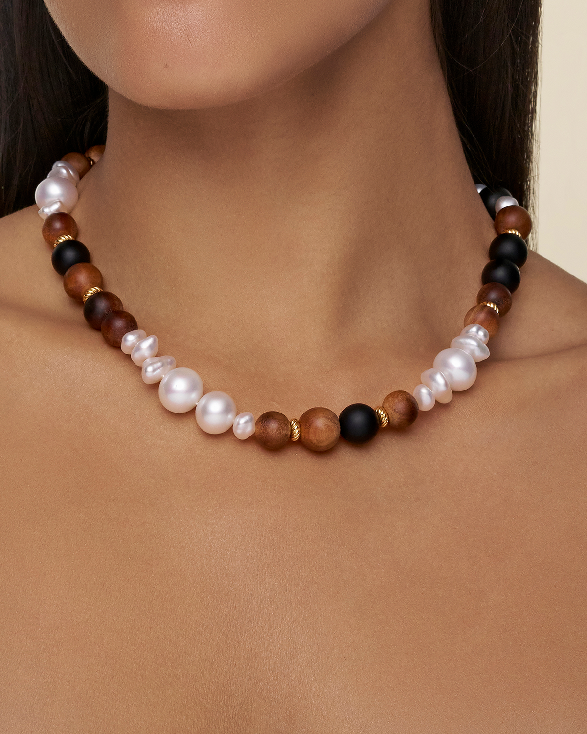 12mm Circle Pearls, Onyx, and SandalwoodKIMBERLEY GOLDEN DUSK PEARL BRACELET