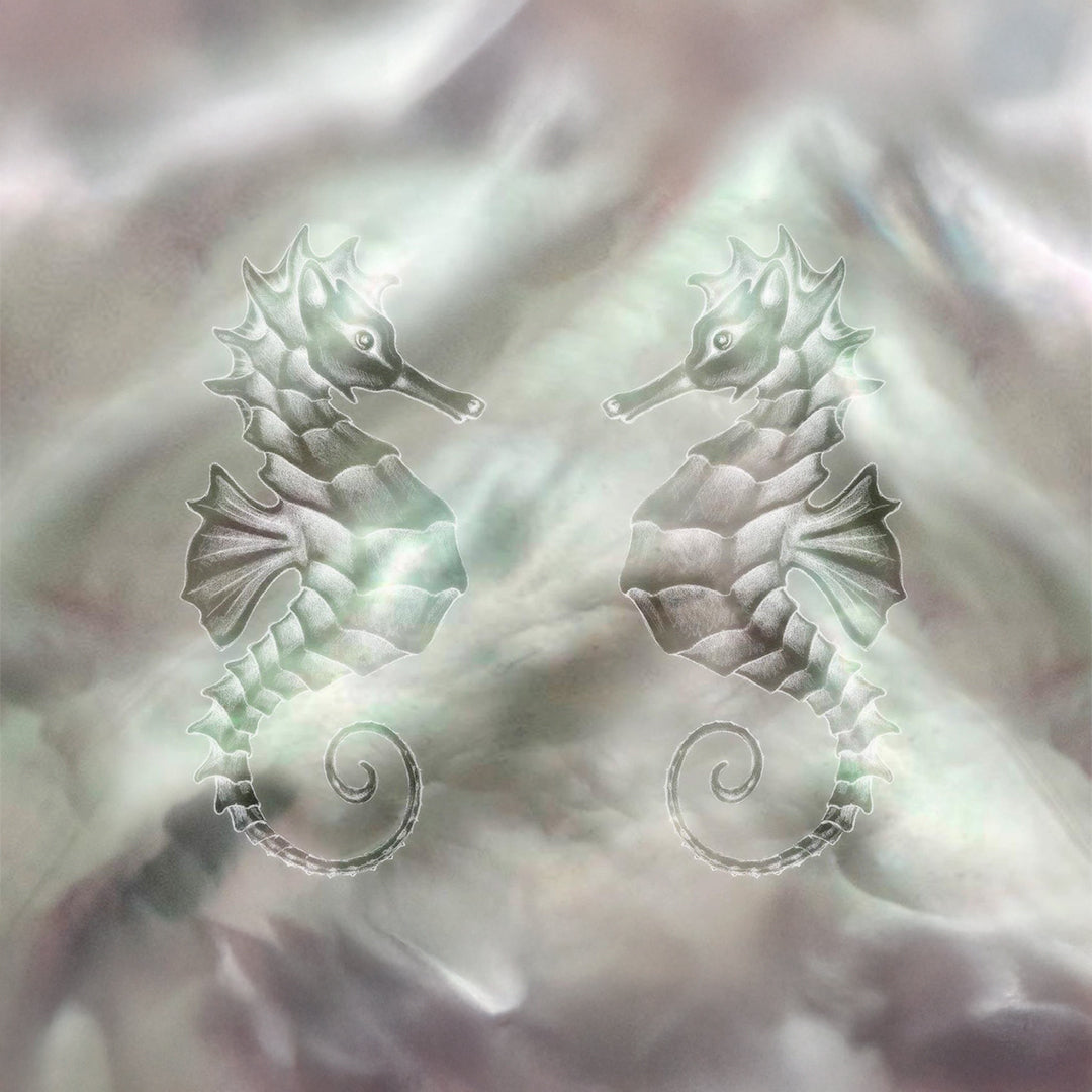 Two seahorses face one another in a tender exchange, symbolising devotion and harmony, while a vivid green emerald rests between them. A tribute to the enchanting underwater world where seahorses dwell and Paspaley pearls are cultivated.