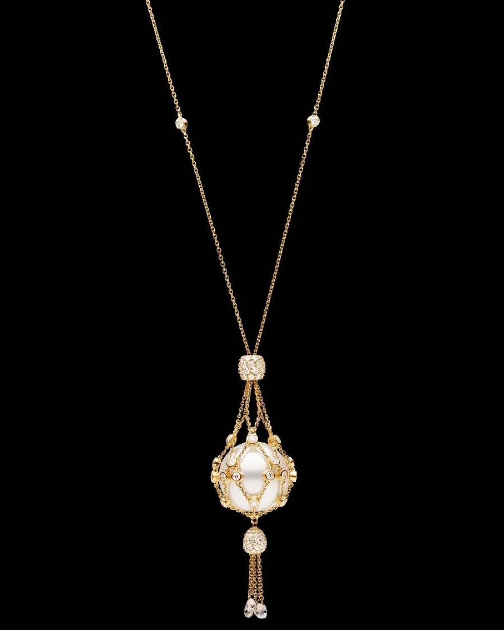 A Lavalier is a special design, allowing the wearer to select their favourite Paspaley pearl, to sit undrilled within the gold mesh net. Inspired by the nautical ropes and nets used to harvest wild pearl oysters, this exceptional design features a chandelier of intricate diamonds and glistening gold tassels.