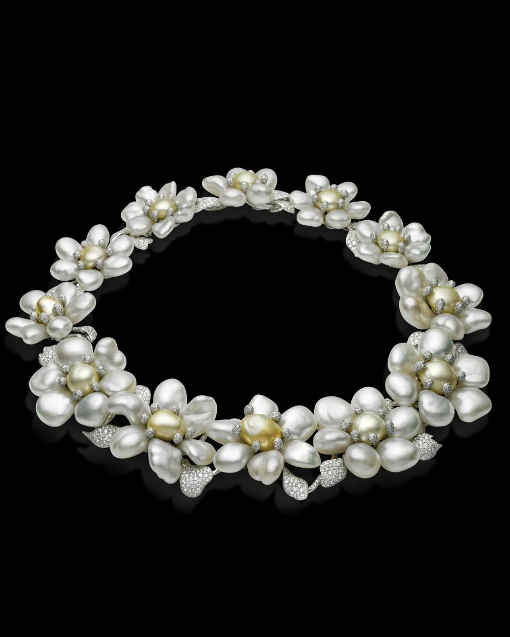 This one-of-kind collier took three decades of harvests to create. Featuring 84 gem-quality Paspaley keshi pearls - only a small quantity of keshi pearls of this size and quality are discovered each year and 2,907 (20.56ct) white diamonds this extraordinary piece reflects a floral iridescent beauty.