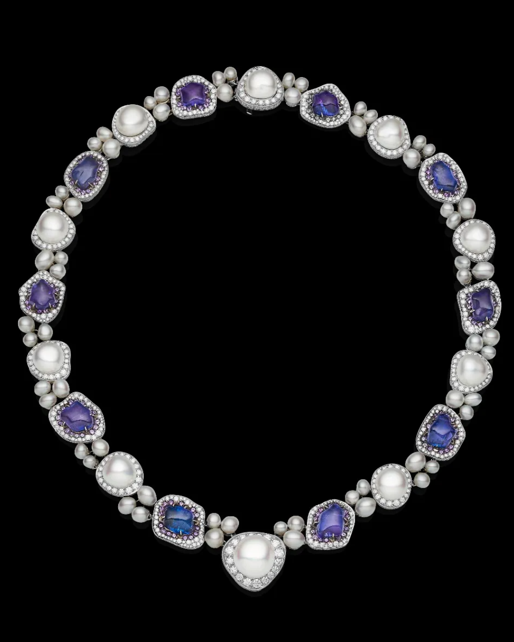 Reflecting the mysterious depths of the sea, this collier combines Tanzanites, sparkling Amethysts and Diamonds with exceptional Keshi pearls from the Paspaley collection. Today, Paspaley is the only company that can create these special pearls, which are reserved especially for our exceptional creations.